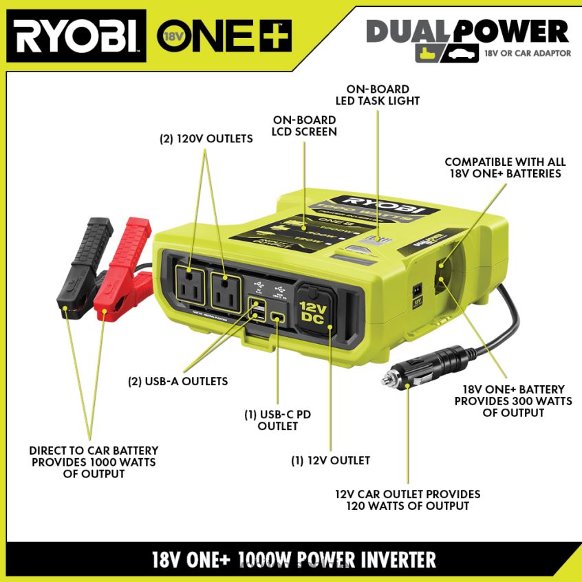 breid uw ryobi one+ systeem uit met de 1000 watt auto-omvormer, een van de meest veelzijdige stroombronnen van ryobi. Deze omvormer maakt gebruik van 18v one+ batterijen, een 12v auto-voedingspoort of een 12v auto-accu voor handige, draagbare stroom. Je kunt meerdere apparaten en kleine apparaten, zoals telefoons en laptops, van stroom voorzien of opladen met de 12V-autoadapter (tot 120 watt uitgangsvermogen), ventilatoren en lampen met behulp van een 18V one+ lithiumbatterij (tot 300 watt uitgangsvermogen) en zelfs tv’s en slowcookers die een auto-accu gebruiken (tot 1.000 watt vermogen). Laad een telefoon tot 6 keer op of laat zelfs een 32” tv tot 2 uur lang draaien met slechts (1) 18v één+ 4ah lithiumbatterij. het is ideaal voor situaties zoals recreatief gebruik op afstand, reizen, externe werkplekken, opladen tijdens het rijden, ttijdens het kamperen, tijdens het kamperen of op een ander moment dat u betrouwbare, draagbare stroom nodig heeft. controleer het uitgangsvermogen, de stroombron, de ingangsspanning en het batterijniveau met het ingebouwde lcd-scherm. u kunt uw ruimte ook verlichten met behulp van de led-werklamp. Deze omvormer beschikt over een verscheidenheid aan stopcontacten, waaronder (2) usb-a-poorten, (1) usb-c pd-poort, (2) 120-volt wisselstroomuitgangen en (1) 12v-autostroompoort. Het beste van alles is dat het deel uitmaakt van het ryobi one+ systeem: elke 18v one+ batterij werkt met elk 18v one+ product. De krachtcentrale van 1000 watt wordt gedekt door een fabrieksgarantie van 3 jaar en omvat de ryi10300a 1000 watt omvormer, auto-accuklemmen, 12v auto-adapter, (4) montagebeugels en een gebruikershandleiding. batterij en oplader worden apart verkocht.