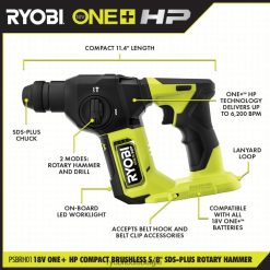 ryobi introduceert de 18v one+ draadloze 1/2 inch sds-plus boorhamerset met (1) 4,0 Ah batterij en oplader . De one+ sds-plus boorhamer is compact en krachtig en produceert tot 5.000 bpm en 1.300 omwentelingen per minuut, waardoor u dit gereedschap voor een verscheidenheid aan zware toepassingen kunt gebruiken. Dit gereedschap beschikt over een keuzeschakelaar met 3 standen, inclusief boorhamer, rotatieboren en alleen beitelmodus. de 4,0 Ah-accu is voorzien van lithium-ioncellen voor een langere levensduur. de 18v-oplader is compatibel met alle one+ lithium-ionbatterijen.