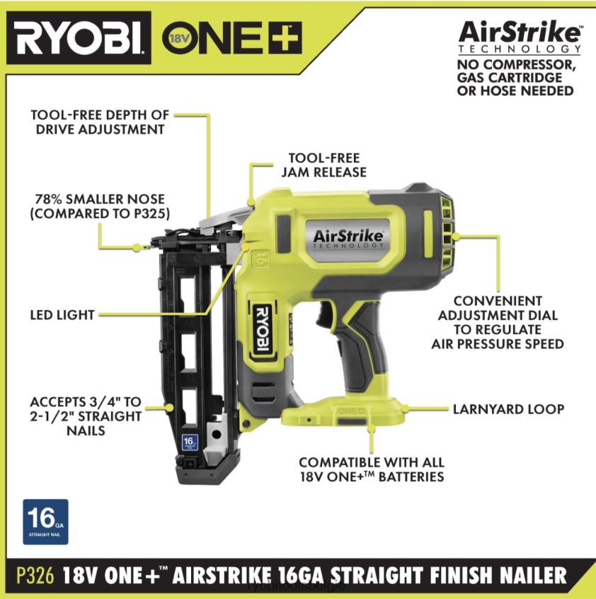 ryobi introduceert de 18v one+ 16-gauge draadloze airstrike afwerkspijkermachine met 1,5 Ah batterij en oplader. Deze afwerkspijkermachine is voorzien van luchtaanvaltechnologie, waardoor luidruchtige compressoren, omvangrijke slangen of dure gaspatronen overbodig zijn. dit betekent een snellere installatie en gemakkelijke manoeuvreerbaarheid op de werkplek. deze spijkermachine met rechte afwerking kan spijkers tot 2-1/2 inch in hardhout zinken. de gereedschapsloze diepte-instelling zorgt voor een juiste instelling van de spijkerkoppen. Met dit spijkerapparaat kunt u langdurig ononderbroken werken door tot wel 1.000 spijkers per acculading te laten zinken. het biedt bovendien een 78% kleinere neus voor toegang tot krappe plekken en superieure aandrijfkwaliteit, vergeleken met p325. er is ook een handige instelknop om de luchtdruksnelheid te regelen voor ooptimale prestaties. Deze afwerkspijkermachine is ideaal voor kroonlijsten, plinten en buitenafwerking en is de perfecte aanvulling op de gereedschapscollectie van elke timmerman of doe-het-zelver. de meegeleverde batterij en oplader zijn compatibel met alle ryobi 18v one+ gereedschappen. Deze kit wordt gedekt door de 3-jarige fabrieksgarantie van de Ryobi en bevat 2 niet-beschadigende pads, een batterij van 1,5 Ah, een 18V-oplader en gebruikershandleidingen.