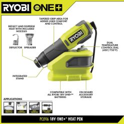 Breid uw ryobi 18v one+ systeem uit met de ryobi 18v one+ warmtepen. De dubbele temperatuurregelknop, variërend van 450 graden/750 graden, maakt het werken met warmtegevoelig materiaal een fluitje van een cent. Het compacte ontwerp van deze 18V-warmtepen is ideaal voor nauwkeurige toepassingen zoals het verwijderen van lijm, het verwijderen van verf, warmteoverdracht, krimpkousen en meer. de geïntegreerde standaard maakt handsfree gebruik eenvoudig. reflecteert en verspreidt warmte gemakkelijk met deflector- en spreidmondstukken die zijn meegeleverd in de ingebouwde accessoireopslag voor extra gemak. onderdeel van het ryobi one+ systeem – elke 18v one+ batterij werkt met elk 18v one+ product. Deze 18v one+ warmtepen wordt gedekt door de 3-jarige fabrieksgarantie van Ryobi en omvat pcl916 18v one+ warmtepen, 18v one+ 2ah lithiumbatterij, 18v one+ oplader, deflectormondstuk, spreadermondstuk en gebruikershandleiding.