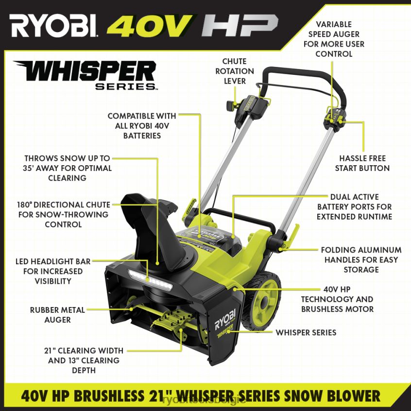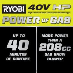betreed het ryobi 40v-systeem met de ryobi 40v hp borstelloze 21″ sneeuwblazerkit. 40v hp-technologie levert meer vermogen dan een 208cc gassneeuwblazer, waardoor dit een echte benzinevervanger is die sneeuw tot 35″ gooit. 40 V pk-technologie combineert borstelloze motoren, geavanceerde elektronica en hoogwaardige lithiumtechnologie om de kracht van gas te leveren zonder het onderhoud en het gedoe. Hij kan tot 19 cm sneeuw ruimen. parkeerplaatsen voor auto’s met de (2) meegeleverde 40 V 7,5 Ah-batterijen, goed voor maximaal 40 minuten looptijd. Als onderdeel van de Whisper-serie, ons stilste productassortiment, is deze sneeuwblazer 84% stiller dan gas, waardoor hij perfect is voor gebruik elk moment van de dag zonder anderen te storen. met een ruimbreedte van 60 cm en een ruimdiepte van 13 inch is deze sneeuwblazer ideaal voor grote sneeuwruimentrottoirs en opritten. Hij beschikt ook over een rubberen/metalen vijzel met variabele snelheid voor grondig ruimen en gecontroleerd sneeuwwerpen met een richtgoot van 180 graden. Laad elk van de meegeleverde 40 V 7,5 Ah-batterijen op in minder dan 75 minuten met de meegeleverde 40 V-snellader. Het beste van alles is dat het deel uitmaakt van het Ryobi 40V-systeem, waarbij elke 40V-batterij met elk 40V-product werkt. Deze 40v pk borstelloze 21” sneeuwblazerset wordt gedekt door de ryobi 5-jarige gereedschapsgarantie van de fabrikant, 3 jaar batterijgarantie van de fabrikant, en omvat ry408010 40v pk borstelloze 21” sneeuwblazer, (2) op40752 40v 7.5ah lithiumbatterijen, op406 40V snellader, chute en directionele montage, en gebruikershandleidingen.