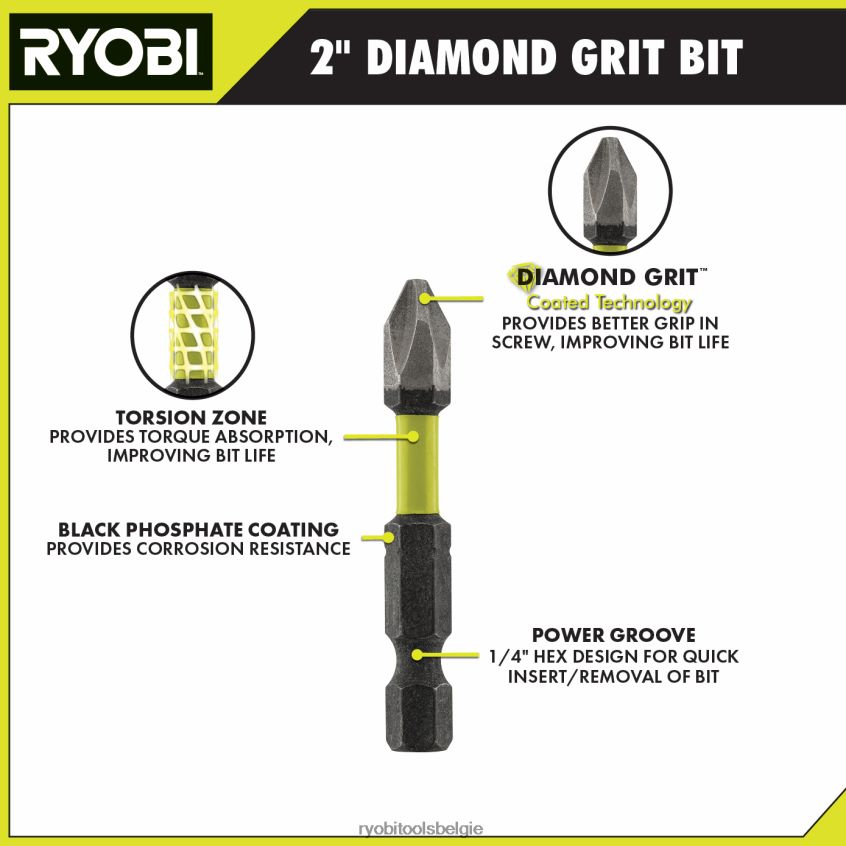 Complimeer uw gereedschapscollectie met Ryobi Diamond Grit Coated-technologie. de 5 st. 2″ impactdrive-bits zijn voorzien van technologie met diamantgritcoating. De technologie met diamantgritcoating biedt een extra beschermingslaag voor een 20x langere levensduur, waardoor de duurzaamheid van de bits wordt verbeterd bij alle kruiskopschroeftoepassingen. Diamantgrit produceert een 2x sterkere grip, wat zorgt voor een sterke grip. voorwaartse grip en plaatsing van de sluiting in de bit. Deze extra grip creëert een vergelijkbare ervaring als een magnetisch geladen bit, maar met een veiligere grip. De met diamantkorrels gecoate technologie grijpt in de kruiskopsluiting tijdens het indraaien, voor een betere pasvorm op Voorkom het strippen van de kruiskop. Deze set is een perfecte oplossing voor alle doe-het-zelversen professionals die op zoek zijn naar minder gestripte schroeffrustratie en optimale controle vóór het rijden. deze 5 st. 2″ slagschroevendraaierbits zijn compatibel met standaard boormachines en slagschroevendraaiers en worden geleverd met (5) 2″ diamant ph2 bits.