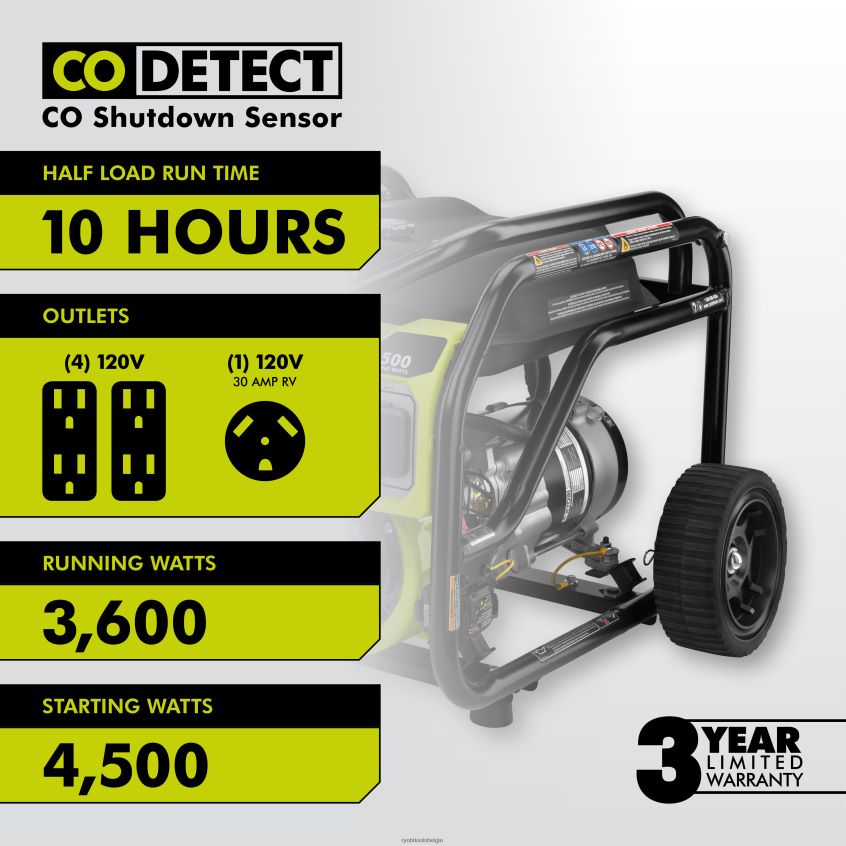 de ryobi draagbare generator van 3600 watt is de perfecte stroomoplossing voor thuis of op de bouwplaats. deze generator levert 3.600 lopende watt en 4.500 start-watt vermogen. uitgerust met een eenvoudig startproces van 3 stappen, start uw generator met gemak. een duurzaam steekwagenframe en 8,5 inch lekvrije wielen helpen de unit te beschermen en maken hem gemakkelijk te transporteren. een automatische spanningsregelaar zorgt voor een betrouwbare en consistente stroomvoorziening en voorkomt schade aan de generator en de daarop aangesloten apparaten. Het gemakkelijk toegankelijke bedieningspaneel heeft 4 120 volt 20 ampère (GFCI-beveiligde) stopcontacten en 1 120 volt 30 ampère camperklaar stopcontact om aan al uw stroombehoeften te voldoen. Deze generator is uitgerust met co-detectietechnologie, inclusief een co-sensor die de generator uitschakelt bij gevaarlijke hoeveelhedenVoor extra veiligheid worden tonnen koolmonoxide gedetecteerd. de ryobi 3.600 watt draagbare generator is ul 2201 gecertificeerd en wordt gedekt door een ryobi 3-jarige beperkte garantie.