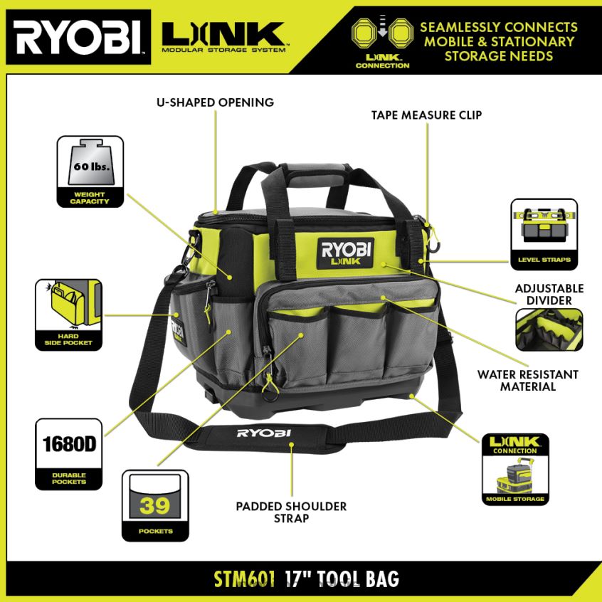 Het ryobi link modulaire opslagsysteem brengt een revolutie teweeg in de opslagindustrie, waardoor u uw leven kunt organiseren, openen en transporteren. De Ryobi Link 17″ gereedschapstas is ontworpen om de zwaarste situaties aan te kunnen. Het gewicht van 20 kg, de robuuste 1680d-vakken en het waterafstotende materiaal houden uw gereedschap beschermd tijdens het transport. De organisatie is eindeloos met 39 binnenvakken en een verstelbare scheidingswand. Het harde zijvak biedt extra bescherming voor telefoons of brillen, terwijl de geïntegreerde waterpasriemen en de meetlintclip ervoor zorgen dat deze spullen gemakkelijk bereikbaar zijn. Draag met behulp van het bovenste handvat of met behulp van de meegeleverde gewatteerde schouderriem. De U-vormige opening biedt maximale opslagcapaciteit en een verbeterde ervaring om alle inhoud te bekijken zonder te gravenBovenal maakt het deel uit van de productlijn van het ryobi link modulaire opslagsysteem die dezelfde vergrendelingstechnologie gebruiken om uw mobiele en stationaire opslagbehoeften naadloos met elkaar te verbinden. beheer uw ruimte met het ryobi link modulaire opslagsysteem.