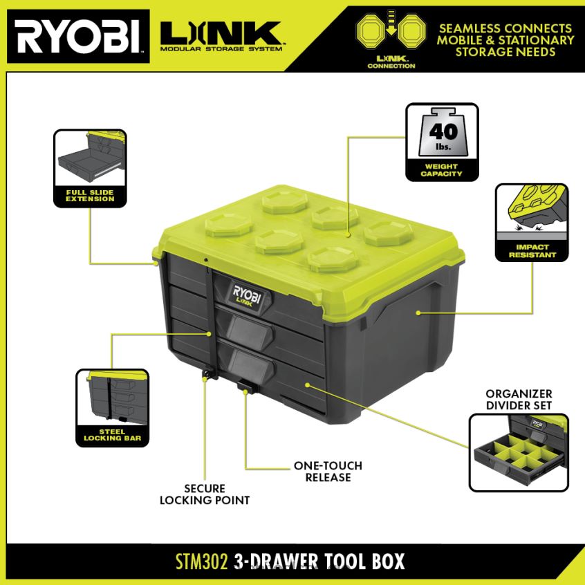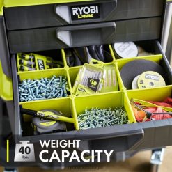 Het ryobi link modulaire opslagsysteem brengt een revolutie teweeg in de opslagindustrie, waardoor u uw leven kunt organiseren, openen en transporteren. De Ryobi Link gereedschapskist met 3 laden biedt opbergruimte voor gereedschap in de zwaarste situaties. voorzien van slagvast materiaal en een draagvermogen van 40 lb. Beveilig uw draagbare gereedschapsopslag eenvoudig met de opbergbare stalen vergrendelstang en het veilige vergrendelpunt. De volledig uittrekbare schuifrails zorgen voor een soepele bediening, terwijl de meegeleverde organizer-verdelerset zorgt voor een maximale organisatie van de ryobi-gereedschapsopslag, waardoor kleine onderdelen op hun plaats blijven. naadloos op elk Ryobi Link mobiel opslagitem stapelen. dit is de perfecte aanvulling op uw assortiment mobiele gereedschapskisten. Het beste van alles is dat het deel uitmaakt van de productlijn Ryobi Link modulaire opslagsystemen die dezelfde lo gebruikencking-technologie om uw mobiele en stationaire opslagbehoeften naadloos met elkaar te verbinden. beheer uw ruimte met het ryobi link modulaire opslagsysteem.