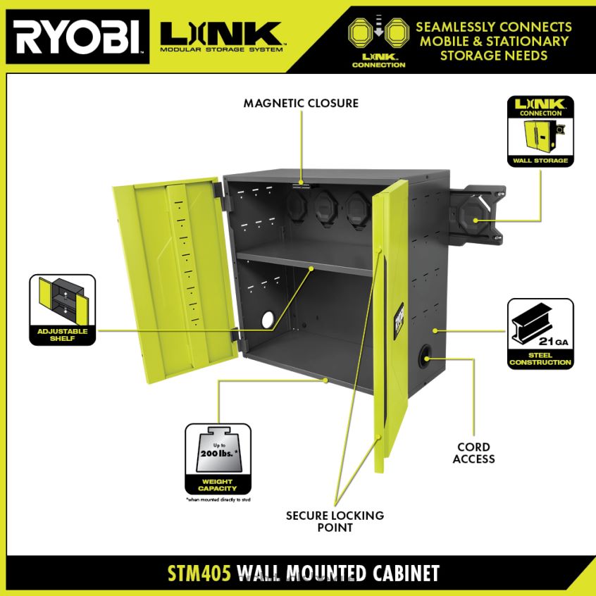 Het ryobi link modulaire opslagsysteem brengt een revolutie teweeg in de opslagindustrie, waardoor u uw leven kunt organiseren, openen en transporteren. De Ryobi Link wandkast is ontworpen om uw garage- of werkplaatsruimte te maximaliseren. Het link-compatibele ontwerp hangt eenvoudig aan een link-wandrail of kan rechtstreeks op stijlen worden gemonteerd. het draagvermogen van 200 lb en de stalen behuizing van 21 ga zorgen voor meer duurzaamheid. Dankzij de in 6 posities verstelbare plank kunt u deze aanpassen aan uw gereedschapscollectie. de geïntegreerde kabeltoegang zorgt voor bescherming van uw batterijen en opladers. beveilig uw spullen eenvoudig met een vergrendelpunt en magnetische deursluiting. Het beste van alles is dat het deel uitmaakt van de productlijn van het ryobi link modulaire opslagsysteem die dezelfde sluittechnologie gebruiken om y naadloos met elkaar te verbindenonze mobiele en stationaire opslagbehoeften. beheer uw ruimte met het ryobi link modulaire opslagsysteem.