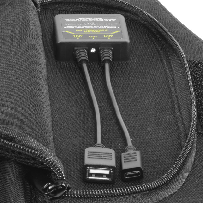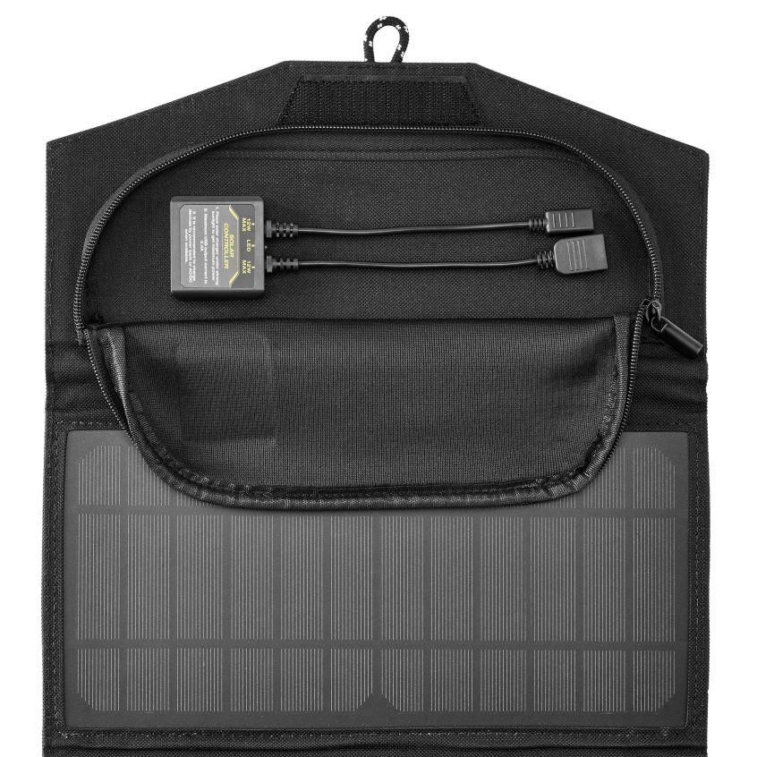 Het ryobi 21 watt opvouwbare zonnepaneel voedt elk klein elektronisch apparaat met een usb-a- of usb-c-poort rechtstreeks vanuit de zon. het is ideaal voor het voeden van uw telefoons, tablets, powerbanks, luidsprekers en zelfs uw ryobi 18v one+ batterijen in combinatie met een compatibele ryobi-stroombron. Het kan een Ryobi 18v one+ 2ah batterij in 3 uur opladen en je telefoon in slechts 1 uur en 50 minuten. Het zonnepaneel van 21 watt is een ideale draagbare stroomoplossing, weegt slechts 1,5 kilo en meet in opgevouwen toestand 12,25”x 6,5”. Het compacte, lichtgewicht, opvouwbare ontwerp maakt het opbergen en transporteren eenvoudig, zodat u hem mee kunt nemen om apparaten op te laden tijdens het wandelen, kamperen, op het strand en overal onder de zon waar u draagbare stroom nodig heeft. het kan fl. worden geopendop de grond om licht op te vangen tijdens piekuren in de zon, of kan onder verschillende hoeken worden opgehangen met behulp van de (7) geïntegreerde ophanglussen om de hoeveelheid licht die hij vangt te maximaliseren. Het ryobi 21 watt zonnepaneel wordt gedekt door de ryobi 3-jarige fabrieksgarantie en omvat het ryi20sp 21 watt opvouwbare zonnepaneel en een gebruikershandleiding.