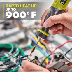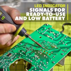 ryobi introduceert de usb lithium-soldeerpenset, die fijne puntprecisie levert met ultieme draadloze draagbaarheid. Deze soldeerpen wordt in minder dan 2 minuten tot 900 graden Celsius verwarmd en is ideaal voor het verbinden van printplaten, het maken van sieraden, het repareren van audioapparatuur en meer. de tipafdekking schakelt de soldeerpen automatisch uit voor gemakkelijk opbergen. Bovendien beschikt deze soldeerpen over een automatische uitschakeling na 10 minuten, waardoor u zich geen zorgen hoeft te maken. De ingebouwde werklamp verlicht uw werkruimte en zorgt voor meer zichtbaarheid en precisie. Dit product is voorzien van een led-indicator om aan te geven wanneer het gereedschap aan het opwarmen is, en om de laadstatus van de batterij aan te geven. Het beste van alles is dat het deel uitmaakt van het Ryobi USB-lithiumsysteem van tools dat een compacte, draagbare en oplaadbare oplossing biedtionen voor draadloze kracht en productiviteit. De USB-lithiumsoldeerpenset wordt gedekt door de 2-jarige fabrieksgarantie van Ryobi en bevat een USB-lithiumbatterij van 2 Ah, USB-kabel, punt met fijne punt, puntafdekking, .031″ soldeer en gebruikershandleidingen.
