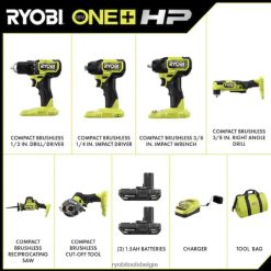 betreed het ryobi 18v one+ systeem met de ryobi 18v one+ hp compacte borstelloze combokit met 4 gereedschappen – 1/2 “boormachine, 1/4″ slagmoersleutel, reciprozaag met één hand, afkortzaag, (2) 18v één+ 2ah lithium-ionbatterij, oplader en gereedschapstas. one+ hp-technologie levert meer vermogen, looptijd, duurzaamheid en snelheid door gebruik te maken van borstelloze motoren, geavanceerde elektronica en hoogwaardige lithiumtechnologie. onze compacte gereedschappen zijn de lichtste en kleinste die we ooit hebben gemaakt, terwijl ze toch optimaal vermogen leveren om de klus te klaren. de 1/2″ boormachine is slechts 6,4″ lang en levert een vermogen van 400 in-lbs. van koppel. de 1/4″ slagschroevendraaier levert een koppel tot 1.700 in-lbs. en tot 3.800 ipm. de reciprozaag met één hand iHet doorslijpgereedschap is 13” lang en levert snelheden tot 3.000 rpm. Het doorslijpgereedschap produceert tot 19.500 rpm om door taaie materialen te snijden, zoals metaal, plastic, tegels, cementplaten, gipsplaten, draadrekken, pvc en vinyl gevelbeplating. 18v one+ 2ah lithium-ionbatterijen zijn voorzien van een geïntegreerde, goed zichtbare brandstofmeter om de resterende looptijd te controleren. Ondersteund door de 3-jarige fabrieksgarantie van de ryobi.