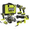 betreed Ryobi’s 18v one+ systeem met de 18v one+ hp borstelloze combokit met 5 gereedschappen – 1/2″ boormachine, 1/4″ slagschroevendraaier, 7-1/4″ cirkelzaag, multitool, led-lamp, 18v one+ 4ah lithium-ion high performance accu, 18v one+ 2ah lithium-ion high performance accu, oplader en gereedschap bag. one+ hp-technologie levert meer vermogen, looptijd, duurzaamheid en snelheid door gebruik te maken van borstelloze motoren, geavanceerde elektronica en krachtige lithiumtechnologie. de 1/2″ boormachine levert tot 20% sneller boren en tot 50% meer koppel bespaart tijd en energie per toepassing. De 1/4″ slagschroevendraaier levert tot 25% sneller rijden en een koppel van 2.220 Nm, waardoor dit gereedschap het vermogen heeft om langer te rijdenr bevestigingsmiddelen door stevige materialen. De 7-1/4″ cirkelzaag levert tot 40% sneller zagen en meer dan 325 sneden per lading. De multitool heeft een agressieve oscillatiehoek van 3,6 graden, wat tot 30% snellere zaagsnelheden oplevert met een instelbare snelheidsknop, die werkt tot 20.000 opm. de ledlamp heeft een lichtopbrengst van 280 lumen en een 130 graden draaibare kop voor een verstelbare lichtbundelrichting. de 18v one+ 4ah en 2ah hoogwaardige batterijen leveren tot 30% meer vermogen dan standaard lithium en zijn voorzien van een geïntegreerde goed zichtbare brandstofmeter om de resterende looptijd te controleren. ondersteund door de 3-jarige fabrieksgarantie van de ryobi.