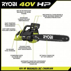 Betreed het ryobi 40v-systeem met de 40v hp borstelloze 20″ kettingzaagkit. 40v hp-technologie levert meer kracht dan een 50cc-gaskettingzaag, waardoor deze kettingzaag een echte benzinevervanger is. Deze kettingzaag maakt meer dan 100 zaagsneden per oplaadbeurt en is uitgerust met een premium ketting met volledige aanvulling. De 40V-technologie combineert een borstelloze motor, geavanceerde elektronica en hoogwaardige lithiumtechnologie voor meer vermogen, een langere looptijd, sneller zagen en een grotere duurzaamheid. ”Zaag- en kettingtakels snijden tot 36”, waardoor hij ideaal is voor vellen, bokken en takken afzagen. Deze kettingzaag heeft een automatisch smeersysteem om de ketting gesmeerd te houden voor een langere levensduur van de ketting en een extra mechanische kettingrem voor bescherming tegen terugslag. uw ketting voor gecontroleerde, zuivere sneden met behulp van de bewerkte chain spannen met ingebouwde gereedschapsopslag. Het beste van alles is dat het deel uitmaakt van het Ryobi 40V-systeem, waarbij elke 40V-batterij met elk 40V-product werkt. Deze 40v hp borstelloze 20” kettingzaagset wordt gedekt door de ryobi 5 jaar gereedschapsgarantie van de fabrikant, 3 jaar batterijgarantie van de fabrikant, en omvat ry405011 40v hp borstelloze 20” kettingzaag, op4080a 40v 8ah lithiumbatterij, op406a 40v snellader, schede, combinatiesleutel, draagtas en gebruikershandleidingen.