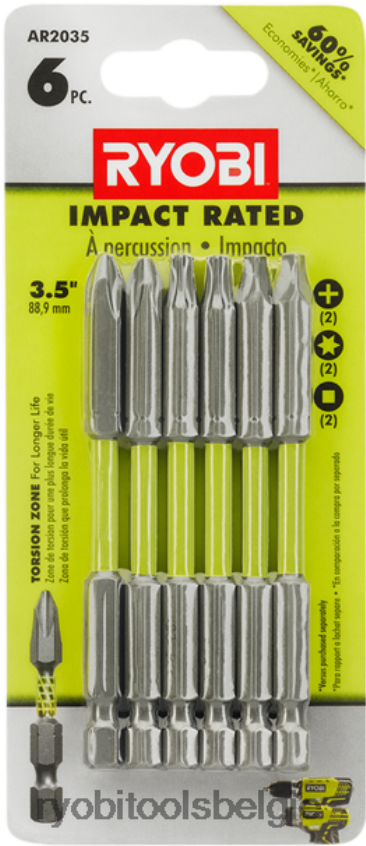 Ryobi slagschroevendraaiers zijn gebouwd om het hoge koppel en de hoge eisen die gepaard gaan met het gebruik van een slagschroevendraaier te weerstaan. Elke bit heeft een torsiezone die is ontworpen om het hoge koppel te absorberen dat de bits in veel rijtoepassingen aannemen. de 6-delige Ryobi-set bevat een mix van 3-1/2 inch kruiskop-, ster- en vierkante bits.