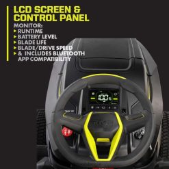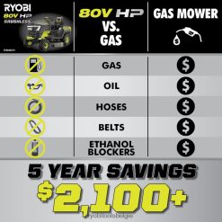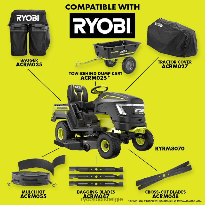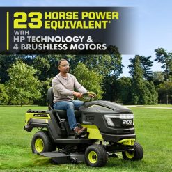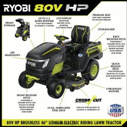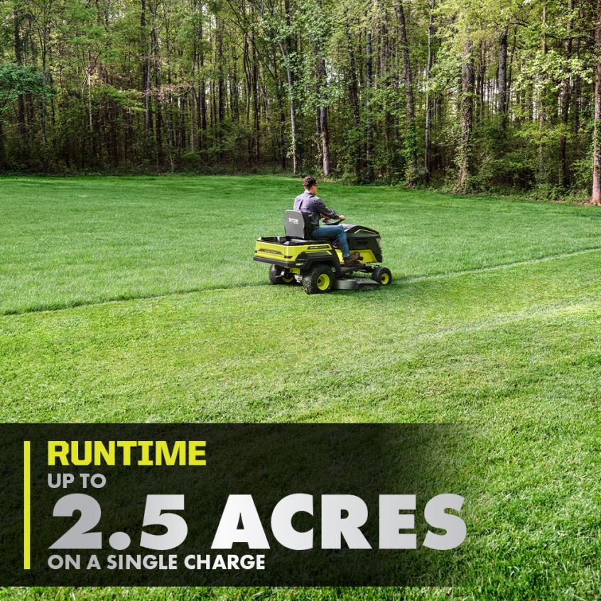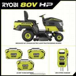introductie van Ryobi’s eerste zitmaaier met lithium-ion batterij, de Ryobi 80v pk 46″ lithium elektrisch rijden gazontractor. 80 V pk-technologie combineert borstelloze motoren, geavanceerde elektronica en lithium-ionbatterijen om het vermogen te leveren dat gelijkwaardig is aan dat van een benzinemotor van 23 pk*, waarbij al het vermogen wordt geleverd, zonder benzine, motoronderhoud en aanzienlijk minder geluid. aangedreven door 4 borstelloze motoren en 3 80 V 10 Ah accu’s om tot 2,5 hectare per acculading te maaien. Wanneer de klus geklaard is, wordt de tractor in minder dan 2,5 uur volledig opgeladen met de meegeleverde hyperlader en ingebouwde oplaadpoort. de meest veelzijdige rijervaring zitmaaier in de industrie met opbergvak aan de voor- en achterkants om mulch, boomstammen, planten of ander materiaal door de tuin te vervoeren. maak snel werk van slepen, met een capaciteit van 500 lbs. en een universele vierkante trekhaak van 2 inch aan de voor- en achterkant van de tractor. De tractor is uitgerust met een 10-gauge zwaar uitgevoerd stalen maaidek en het kruislings gesneden multi-messensysteem dat gebruik maakt van 6 stalen messen om een superieur maairesultaat te bereiken. Verwijder het maaidek in minder dan 90 seconden voor snel onderhoud van het mes. Het full-colour verlichte LCD-scherm geeft de looptijd, het batterijniveau en de oplaadstatus weer, terwijl u met de Ryobi zitmaaier-app uw oplaadstatus vanaf uw telefoon kunt controleren. Mobiele service beschikbaar in bepaalde regio’s Als uw zitmaaier aandacht nodig heeft, kan een gecertificeerde Ryobi-ondersteuningstechnicus direct bij u thuis een diagnose stellen en onderhoud uitvoeren. Voor sommige diensten kan het nodig zijn dat u uw maaier naar een van de meer dan 300 landelijke servicecentra brengt. Deze tractor is met trots gemaakt in de VS. materialen uit de hele wereld en heeft een beperkte garantie van 5 jaar.