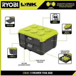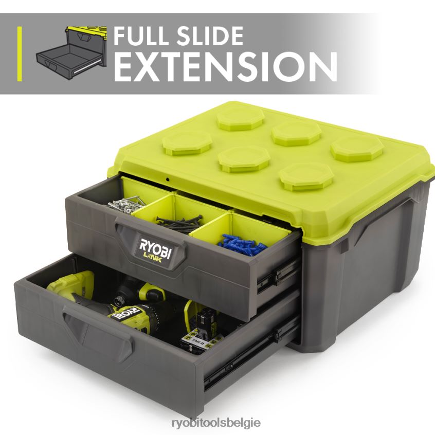 Het ryobi link modulaire opslagsysteem brengt een revolutie teweeg in de opslagindustrie, waardoor u uw leven kunt organiseren, openen en transporteren. De Ryobi Link gereedschapskist met 2 lades biedt opbergruimte voor gereedschap in de zwaarste situaties. voorzien van slagvast materiaal en een draagvermogen van 40 lb. Beveilig uw draagbare gereedschapsopslag eenvoudig met de opbergbare stalen vergrendelstang en het veilige vergrendelpunt. De volledig uittrekbare schuifrails zorgen voor een soepele bediening, terwijl de meegeleverde organizer-verdelerset zorgt voor een maximale organisatie van de ryobi-gereedschapsopslag, waardoor kleine onderdelen op hun plaats blijven. naadloos op elk Ryobi Link mobiel opslagitem stapelen. dit is de perfecte aanvulling op uw assortiment mobiele gereedschapskisten. Het beste van alles is dat het deel uitmaakt van de productlijn Ryobi Link modulaire opslagsystemen die dezelfde lo gebruikencking-technologie om uw mobiele en stationaire opslagbehoeften naadloos met elkaar te verbinden. beheer uw ruimte met het ryobi link modulaire opslagsysteem.